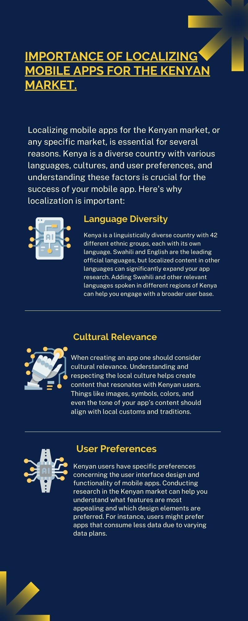 Localizing your app for the Kenyan market is not just a matter of translation, it is adapting your app to fit the user preferences, needs, and cultural context of the local users. User engagement. User satisfaction and improved app performance can lead to the success of the app.