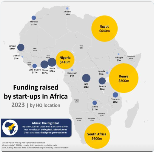Funding raised by startups in Africa in 2023: 1. Kenya: $800M 2. Egypt: $640M 3. South Africa: $600M.